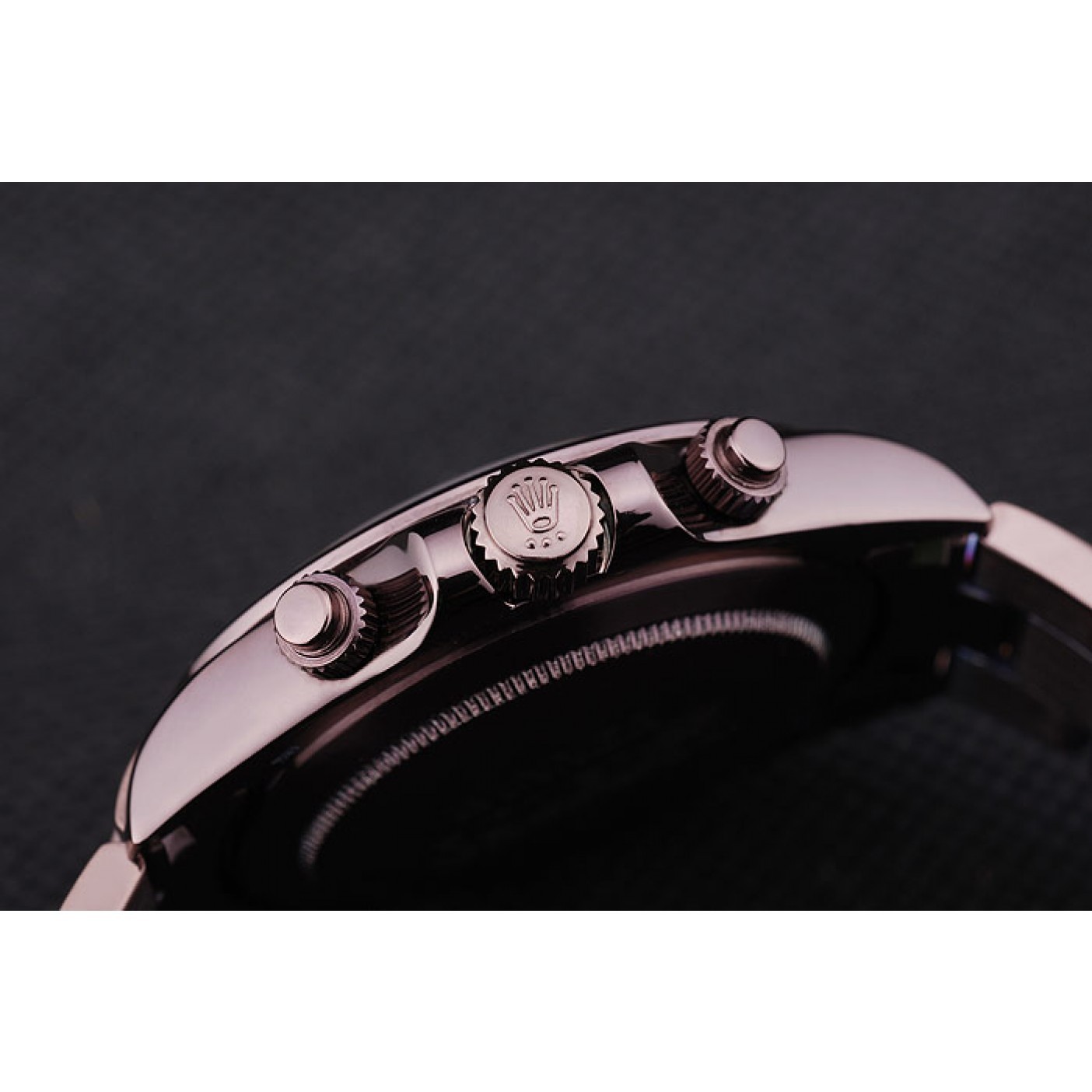Corona Corona intaglio in acciaio inossidabile marrone rosato con logo Rolex e due corone intaglio a pulsante più piccole su entrambi i lati