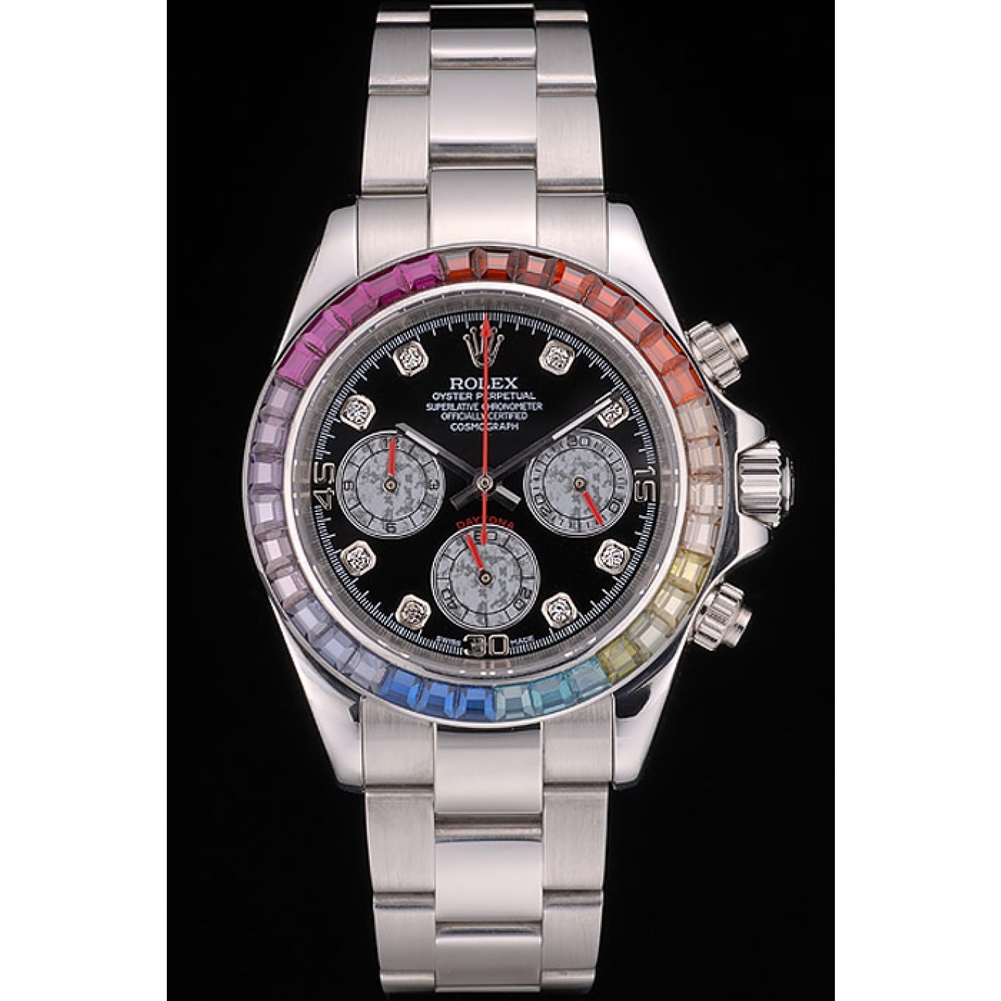 Rolex Daytona Cosmograph Rainbow Crystals Bezel Stainless Steep Strap quadrante nero 80250
