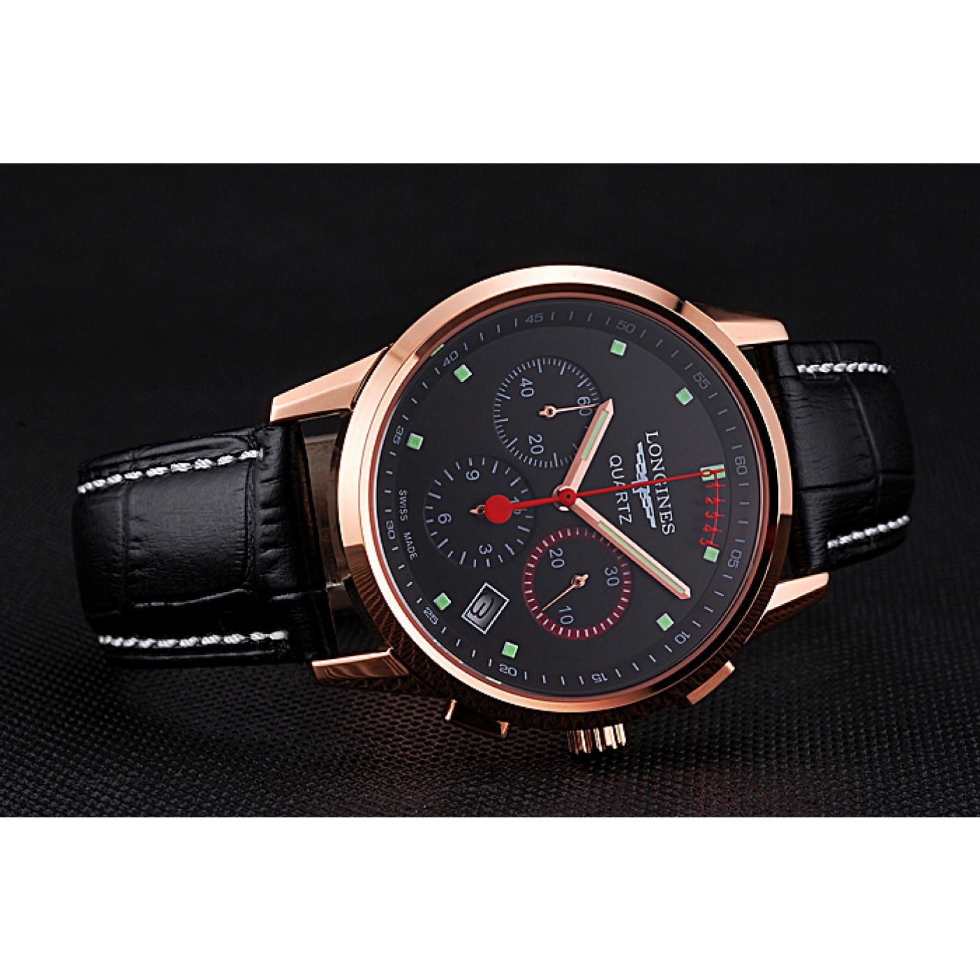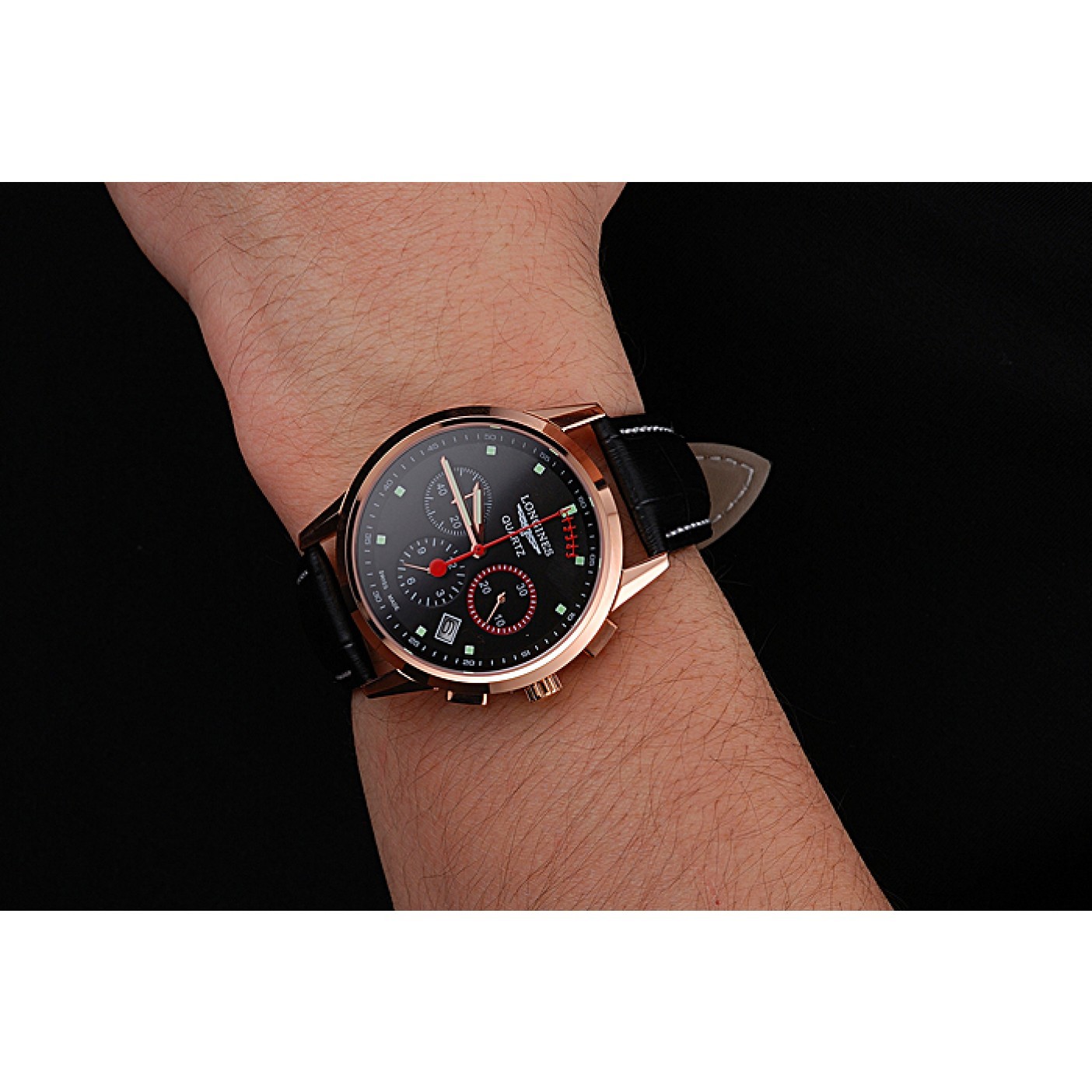 Bracciale Logo e cinturino in pelle di coccodrillo nero con logo Longines goffrato a caldo con cuciture in filo bianco e logo e Longines inciso in oro rosa 18k fibbia placcata